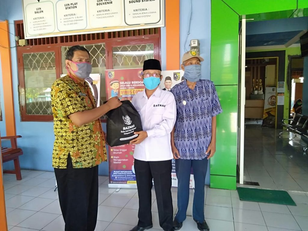 Anggota Badan Amil Zakat Daerah (Bazda) Kabupaten Demak dengan diketuai oleh Bapak Bambang Soesetiarto, SIP, membagikan 100 paket sembako bagi warga kurang mampu dan terdampak pandemik corona melalui Kantor Kecamatan Kebonagung. Kamis (04/06/2020).