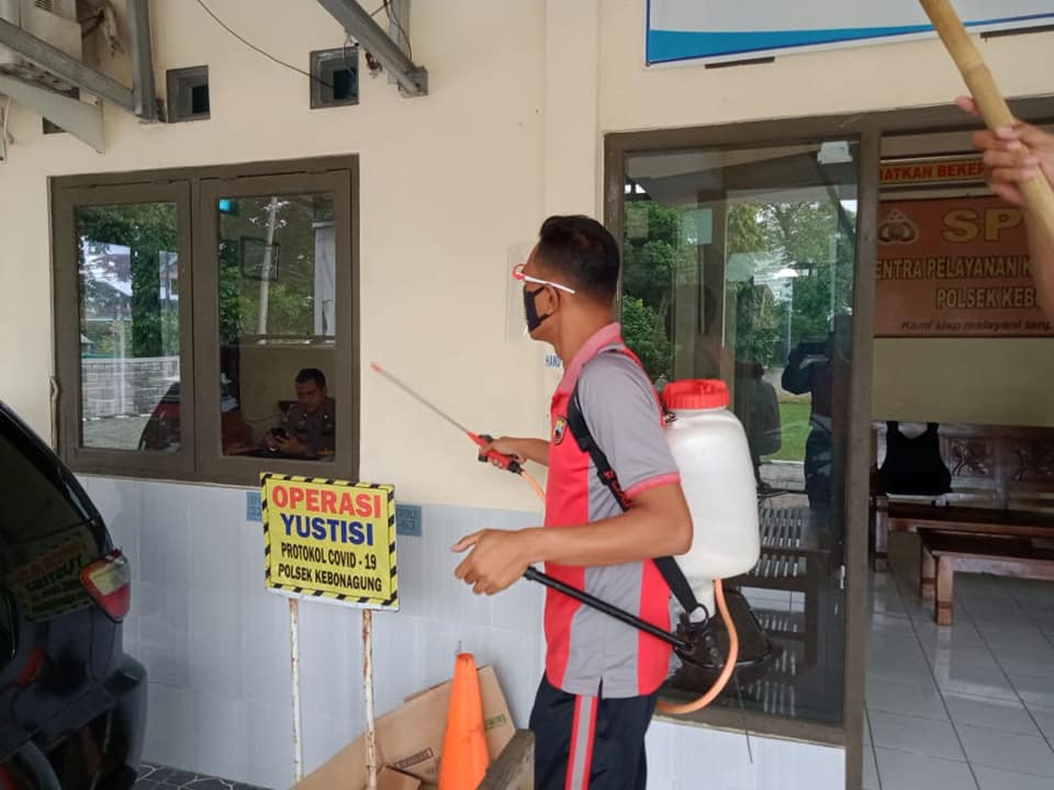 Kapolsek Kebonagung AKP Bambang Uwarno SH. memimpin kegiatan penyemprotan cairan Desinfektan di Mako Polsek Kebonangung Polres Demak pada Jumat 15/01/2020.